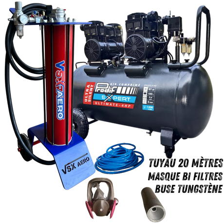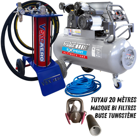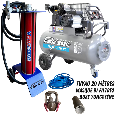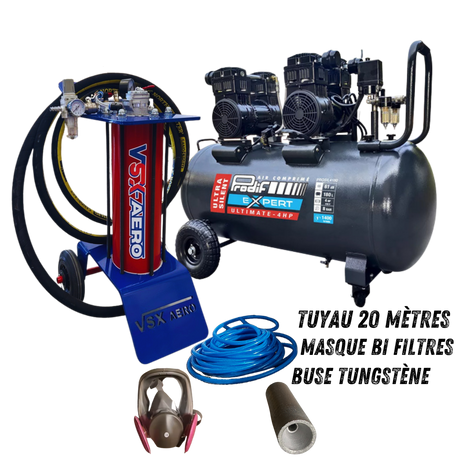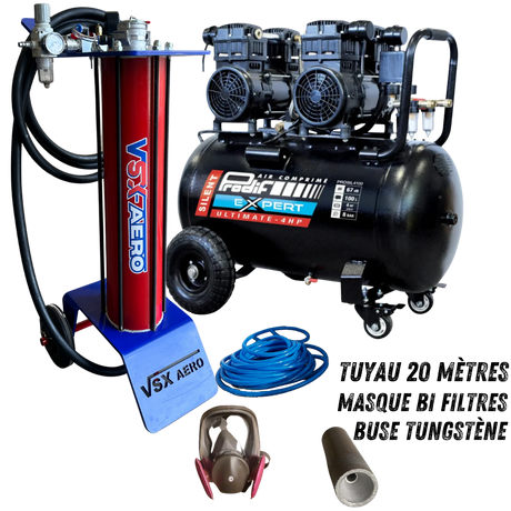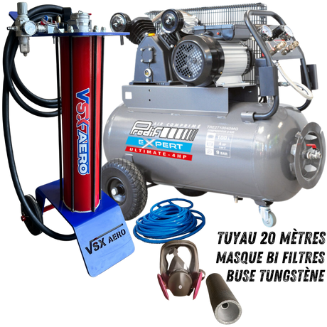 Kit complet avec aérogommeuse, compresseur 4 CV , tuyau de raccord 20 mètres et accessoires ( Buse tungstène, porte buse, cagoule de protection.)