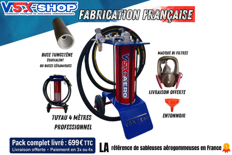 | Description | Sableuse aérogommeuse 20 Litres VSX Utilisation ponctuelle de rénovation avec un compresseur 50 Litres minimum. Inclus … | Sableuse aérogommeuse 40 Litres VSX Utilisation ponctuelle de rénovation avec un compresseur 100 Litres minimum … | Sableuse aérogommeuse 75 Litres VSX. Utilisation ponctuelle de rénovation avec un compresseur 150 Litres … | Sableuse / Aérogommeuse VSX Aéro 8 – Fabrication française 🇫🇷Buse tungstène + masque bi-filtres inclusRéglage … | Sableuse Aérogommeuse VSX Aéro 15 Fabriquée en France, la sableuse aérogommeuse VSX Aéro 15 est … |